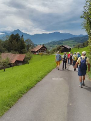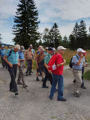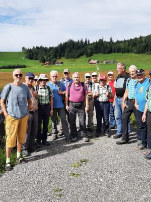 Die Wetteraussichten für diesen Tag waren nicht schlecht, musste doch erst am späteren Nachmittag mit Regen gerechnet werden. Am Bahnhof Luzern hatte der Wanderleiter Ruedi Thali die gutgelaunte 18-köpfige Wandergruppe beisammen. Diese fuhr um 08.39 Uhr mit dem Voralpen Express Richtung Arth-Goldau. Nach knapp einer Stunde gemütlicher Fahrt erreichte der Zug Rothenthurm, wo wir zu unserer Wanderung starteten. Nach einem kurzen Marsch kamen wir am roten Turm vorbei zum Restaurant Turm, wo wir uns wie üblich mit Kaffee und Gipfeli stärkten. Danach bestiegen wir den Bus, der uns zur äusseren Altmatt brachte. Bei recht freundlichem Wetter durchwanderten wir die einzigartige Moorlandschaft. Mehrere Informationstafeln weisen darauf hin, was es in diesem Schutzgebiet alles zu sehen gibt. Und wie sich bald zeigte waren wir nicht die Einzigen, die auf diesen Pfaden unterwegs waren. Eher zufällig begegneten wir einer Gruppe von Ornithologen, die damit beschäftigt war, junge Vögel zu beringen und darüber Buch zu führen. Die kleinen Vögelchen werden in Netzen gefangen, beringt und danach wieder freigelassen, wie wir am Beispiel einer Rauchschwalbe mitverfolgen konnten. Danach wanderten wir gemütlich nach Rothenthurm zurück, wo wir mittags zum zweiten Mal im Restaurant Turm einkehrten. Das Tagesmenu hatte Ruedi vorbestellt. Es gab eine reichliche Portion Rahmschnitzel mit Nudeln und Gemüse und zum Abschluss ein feines Dessert. Gut gestärkt nahmen wir die zweite Etappe unter die Füsse. Der Weg führte entlang des Dorfes auf die sogenannte Alte Strasse, die aktuell vor allem von Velofahrern und Wanderern benutzt wird. Für erstere ist besonders die Talfahrt hinunter nach Sattel und danach ins Aegerital ein wahrer Genuss. Wir als Fussgänger benötigten für den Abstieg nach Sattel etwas mehr Zeit, damit wir dessen Auswirkungen nicht am nächsten Tag in den Knien spürten. Am Ziel angelangt, genossen wir das kühle Blonde auf der Wirtschaftsterrasse. Auf dem Weg zur Bahnstation erreichten uns dann die ersten Regentropfen, und später auf der Fahrt entlang des Zugersees konnten wir noch einen prächtigen Regenbogen bestaunen. Dank Wetterglück hatten wir eine schöne und abwechslungsreiche Wanderung, für die ich mich im Namen aller Teilnehmer bei Ruedi nochmals bedanken möchte.